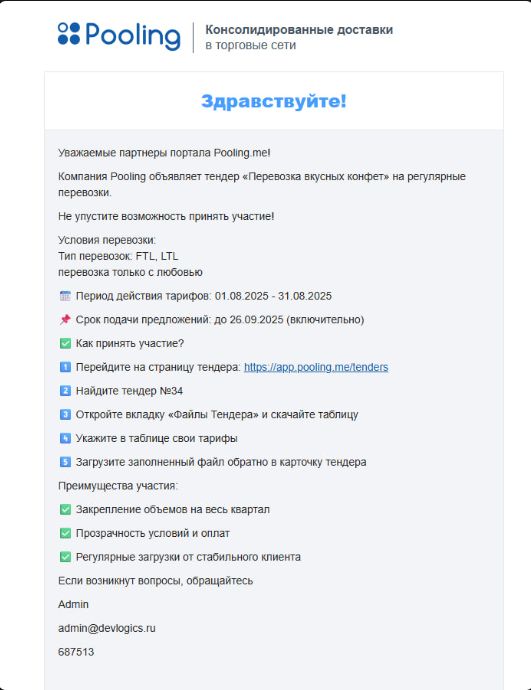 5. Перевозчики-участники получат уведомление и смогут отправить свои предложения.