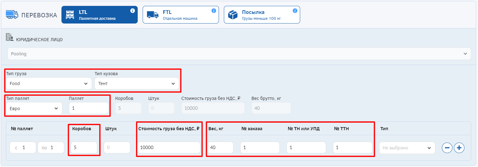- при отсутствии подписанного договора оферты на оказание услуг по доставке сборного груза необходимо проставить галочку "Оплата через Pooling".