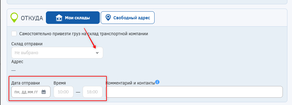 - Укажите дату и время отправки и доставки груза (указанная дата доставки в заявке является ориетировочной).