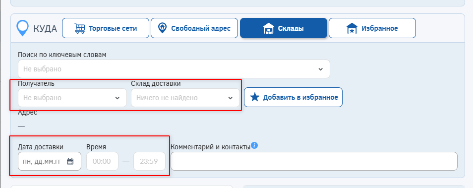 *Если вы не знаете как называется склад грузополучателя в Pooling, то его можно найти по ключевым словам из адреса. Также склады можно добавить в избранное и использовать из соответствующей вкладки.
