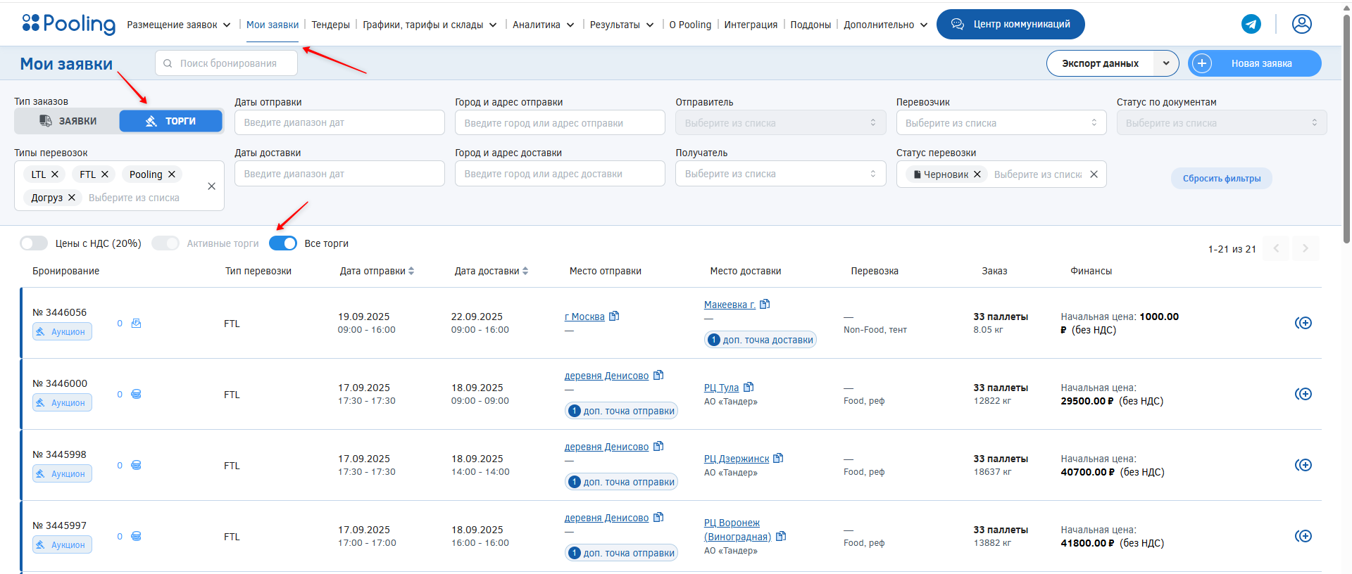 8. Все цены в сервисе Pooling указаны без НДС. Однако для торгов доступна опция ставок с НДС. После завершения торгов цена автоматически пересчитывается без НДС. Переключить режим вы можете в специальном разделе страницы «Мои заявки» — «Торги». Там же отображаются все ваши активные торги.